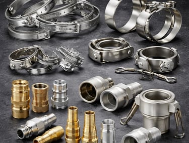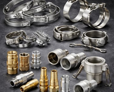worm drive clamps, T-bolt clamps, quick-release couplings, camlock couplings, hose nipples